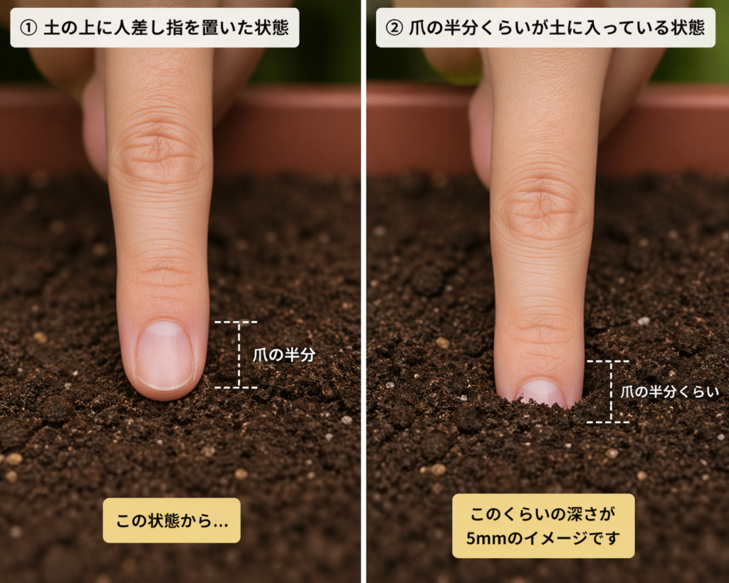 育苗ポットまたはセルトレーなどに種まき用培養土を入れ、1〜2粒ずつ種をまきます。深さは5mm程度が目安です。